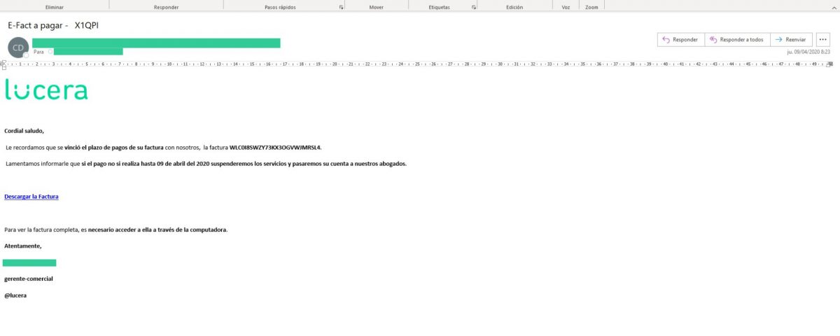 Si bien el mail del remitente parece ser correcto, y supuestamente es fiable, al verificar la dirección a la que nos reenvía el enlace al que debemos pulsar para descargar la factura no lo es.
