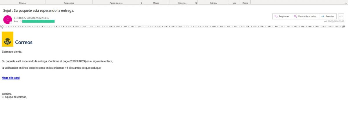 Si bien el mail del remitente parece ser correcto, y supuestamente es fiable, al verificar la dirección a la que nos reenvía el enlace al que debemos pulsar no es la que se recoge en su propio texto, lo que nos indica que se trata de un correo fraudulento