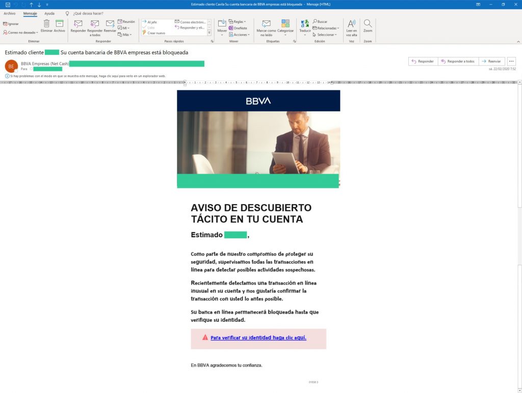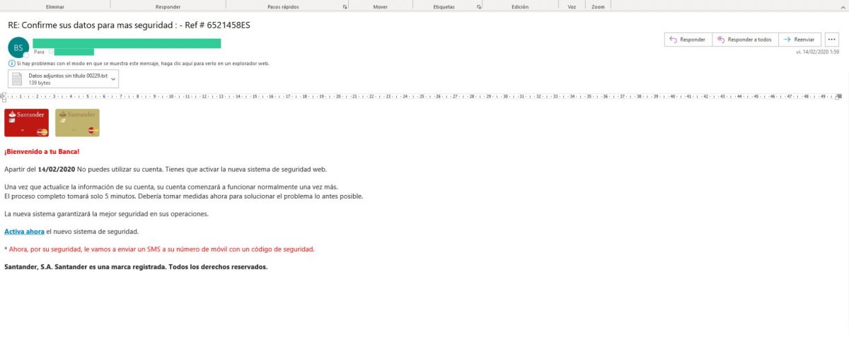 El mail del remitente parece ser correcto, pero el dominio al que hace alusión no pertenece a la entidad bancaria